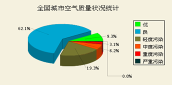 7月7日全國城市空氣質量日報對全國城市空氣質量狀況的檢測結果做了詳細的介紹,其中監(jiān)測指標為空氣質量指數(shù),即air quality index(AQI)。其中,3.1%的城市為重度污染,6.2%的城市為中度污染,19.3%的城市為輕度污染,62.1%的城市空氣質量為良,僅有9.3%的城市空氣質量為優(yōu)。
